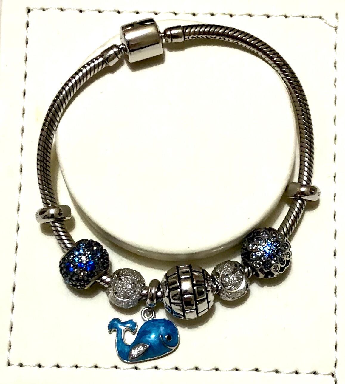 シルバー ブレスレット フープ: 直径 6 cm、シリンダー クラスプ付きのコード タイプ、8 つのチャーム: ブルーの定義、ブルー ストーンのボール、2 ドンバス シルバー レンガのボール、2 マーブル ボール、2 シルバー ドンナ、1 ソフト ブルー ストーンのボール。