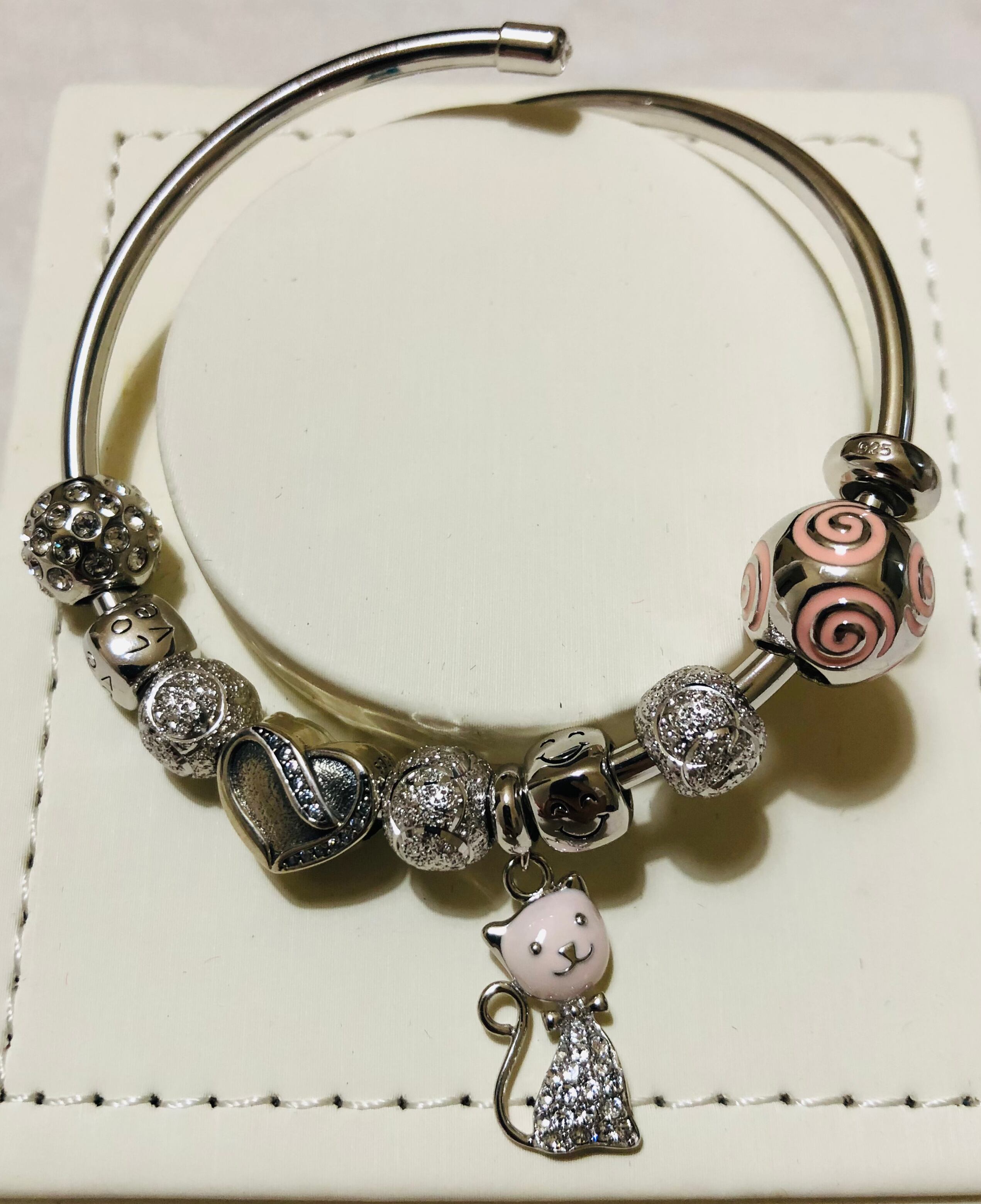 ロジウムメッキのキャットペンダントとホワイトブリリアントストーンをあしらったクラスプなしのフープブレスレット、