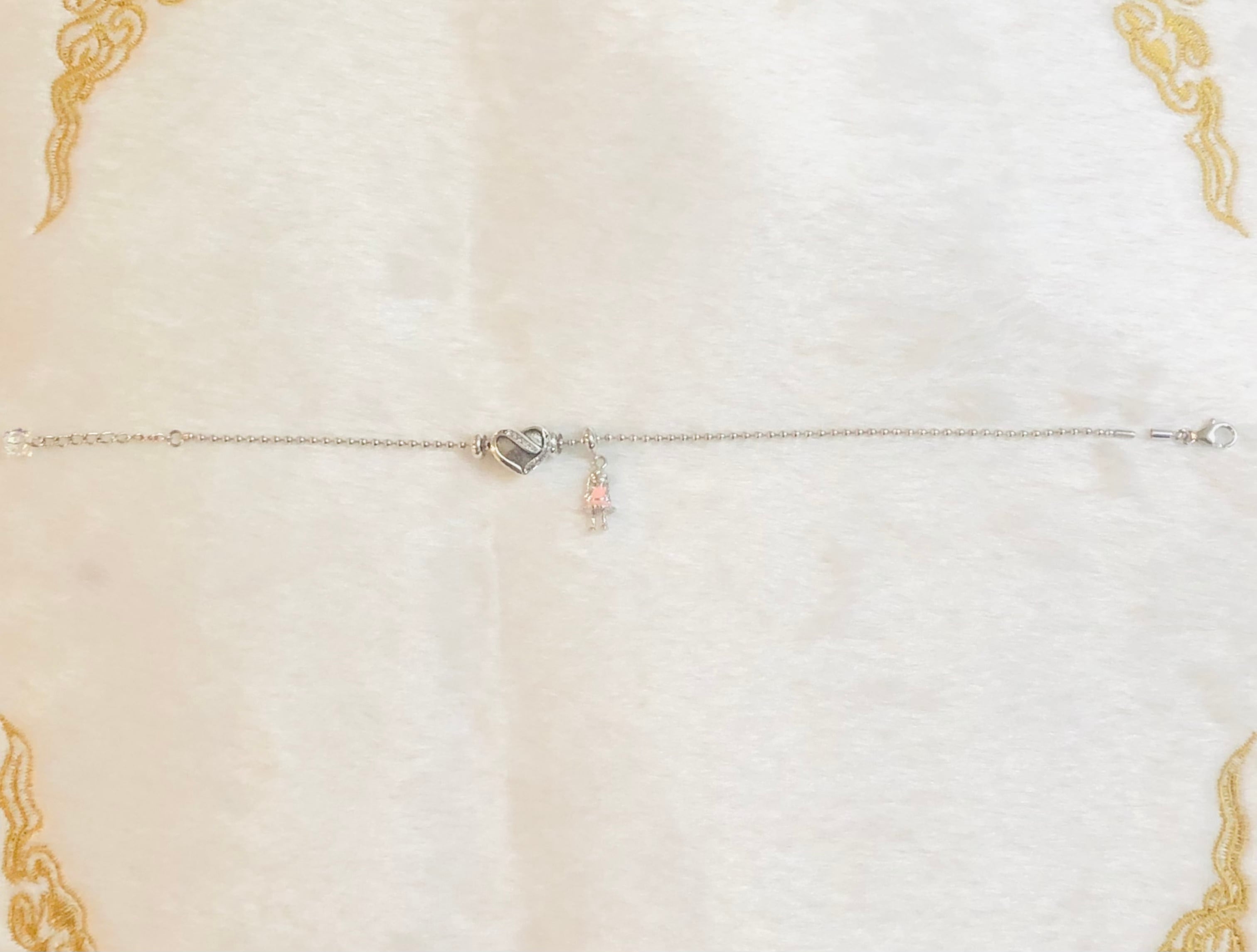 ダイヤモンド付きハートとピンクのドレスを着た女の子の 2 つのチャームが付いた 19 cm の連続ビーズ ブレスレット。