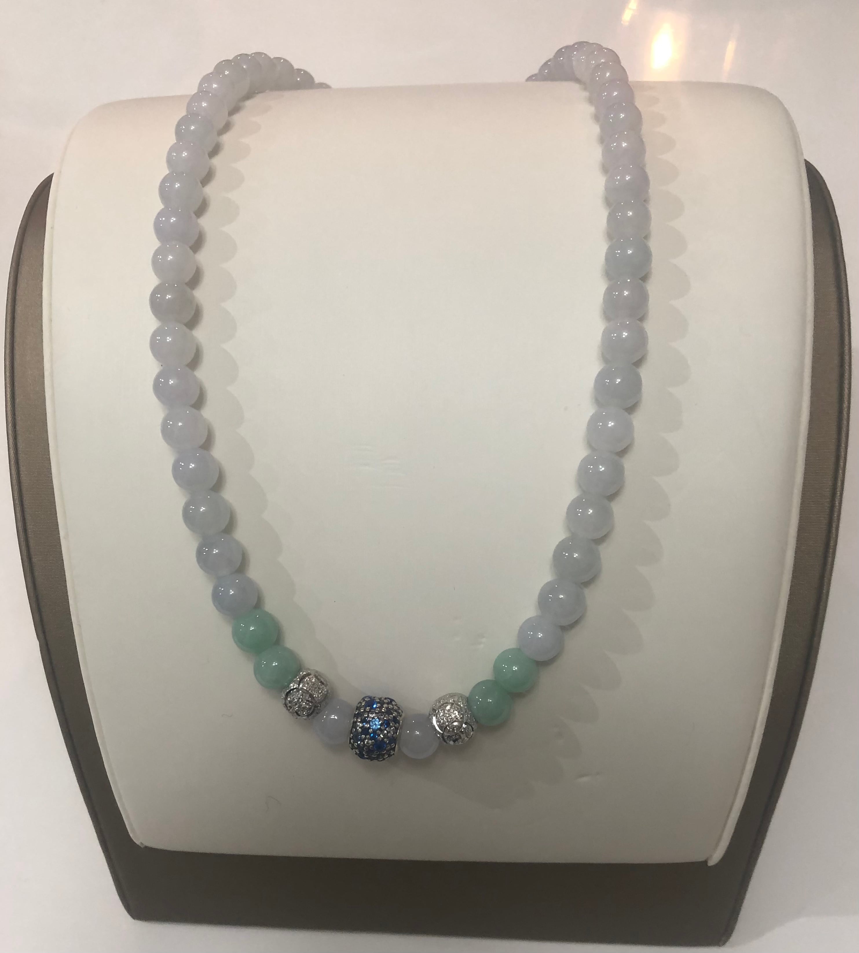 J AD E 運や癒しなどのエネルギーを引き寄せるムーンストーンソフト ミルキー グリーン ホワイト ボール ネックレス、ブルー ストーンをセットしたブルー シルバー ペンダント