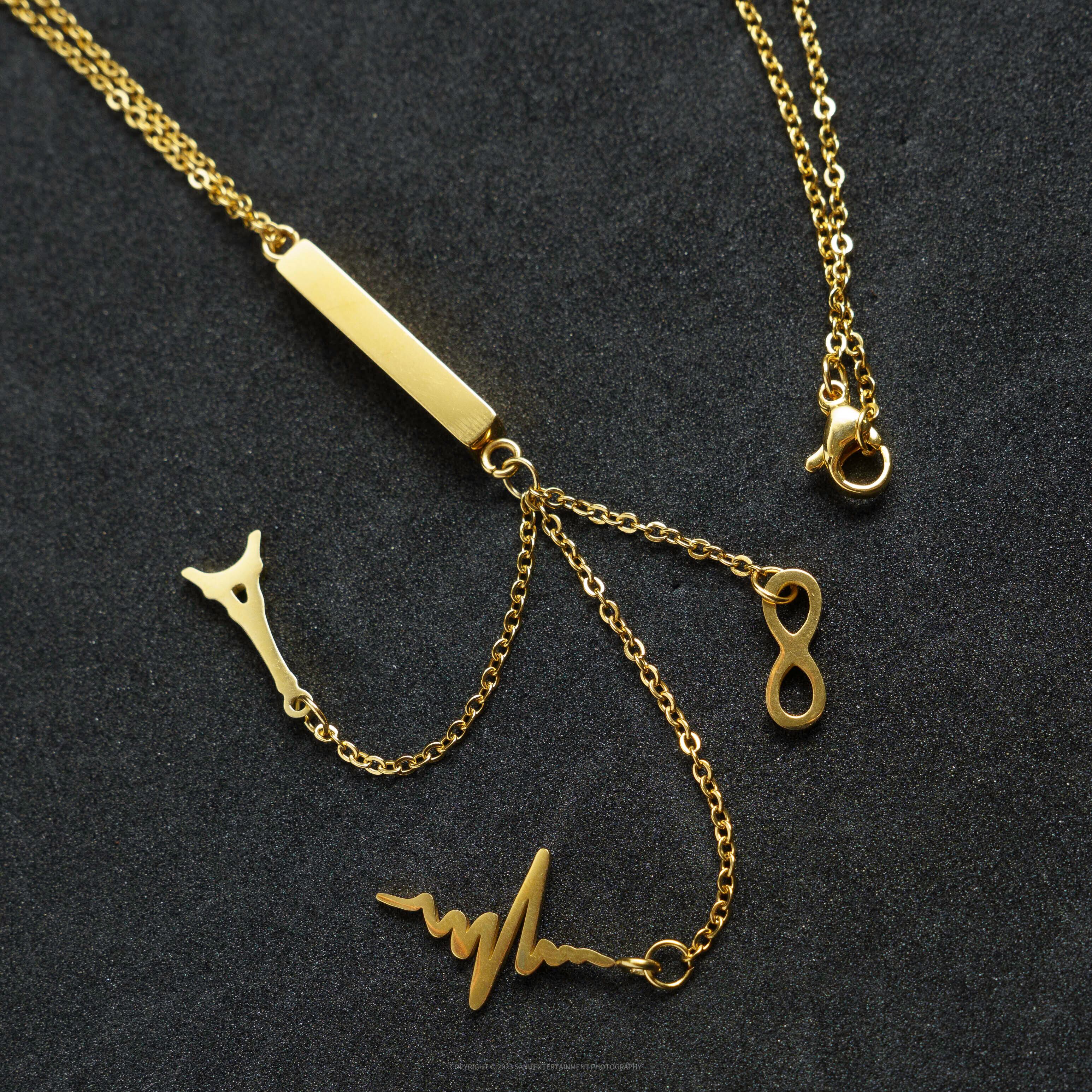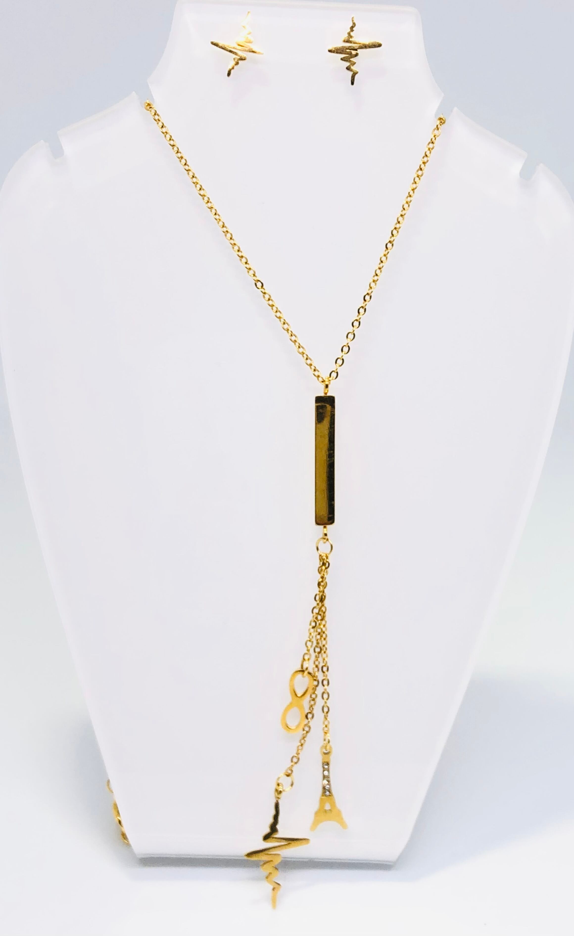 18Kゴールドメッキスチール(悪いバイブから保護し、ストレスを吸収し、幸運を引き寄せます)3 つのチャーム付きチェーン: 3 つのジルコン、アルファ サイン、稲妻のエッフェル塔。
