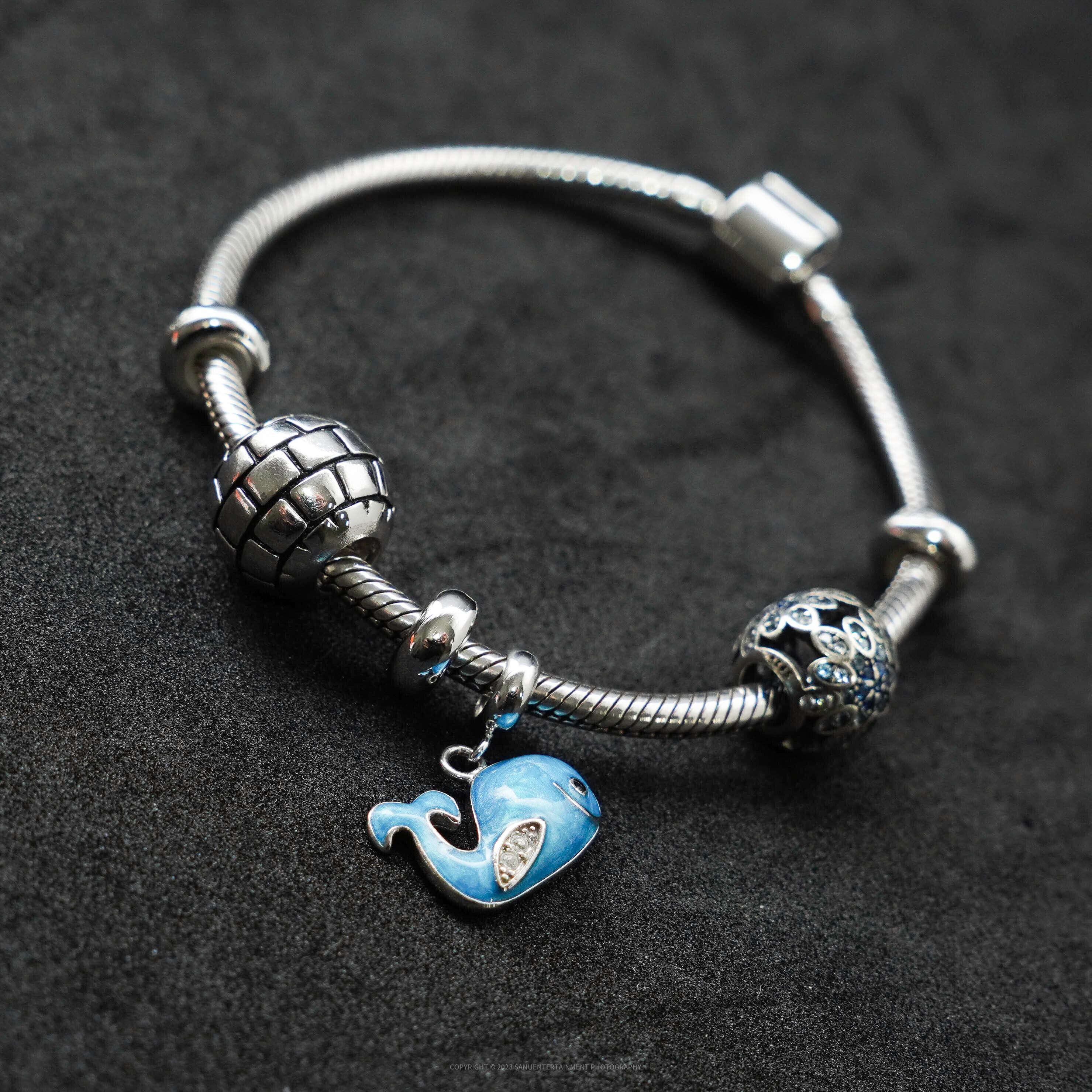 @p@ndo@ 18 cm ブレスレット、チャーム: 9 mm、1 cm x 1 cm イルカ、目にオニキス ストーン、側面にホワイト ジルコン、幅 4 mm のドンナ、ブルー ストーンとホワイト ジルコンのボールがひまわりを形成、ブレスレットとチャーム、シルバー 925